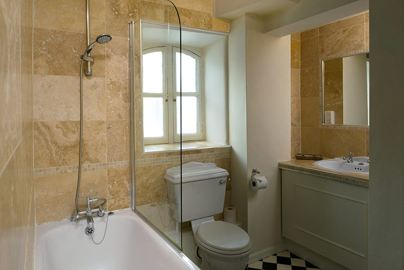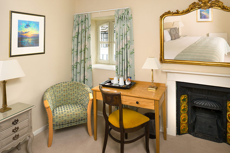 Situated on the first floor overlooking the courtyard, this pretty room has an original fireplace and an ensuite bathroom with bath and shower over the bath. It offers twin beds or super-king deluxe double bed